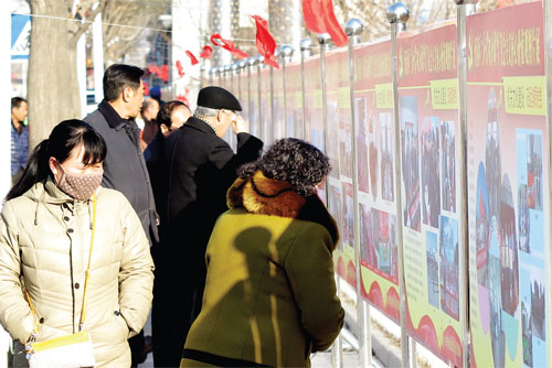 2月21日,忻府區(qū)區(qū)委、區(qū)政府門前“踐行社會(huì)主義核心價(jià)值觀”圖片展,吸引了眾多市民觀看學(xué)習(xí)。 (張志遠(yuǎn) 攝)