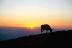南臺也被稱為花臺,各種野花競相開放,清新雅致。遠眺峰巒疊嶂,漸入云端,近觀,地上完全鋪上了綠毯,牛馬自在地曬著太陽吃著美味肥草。南臺景色優(yōu)美,但師傅們很清苦,夏天也身穿棉袍,因為寺廟里比較陰冷。山上缺水,終年靠接雨水喝為生。我們坐著朋友的紅色越野車下山,擺出各種pose,留下了與綠地、藍天、白云、奶牛在一起的絕美畫面。