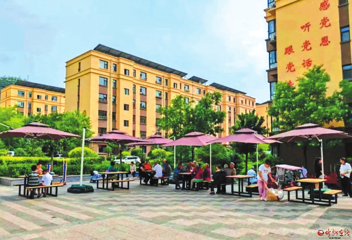 為把好事辦實,社區(qū)迅速聯(lián)合保德縣佳美物業(yè)管理有限公司啟動“共建共享”便民行動。通過線上線下征集大家意見,選定適配的環(huán)保設施,依人流分布規(guī)劃7套桌椅和遮陽棚位置。為不影響居民日常生活,施工特意選在周末時間,社區(qū)全程監(jiān)督質量,物業(yè)專人驗收把關,僅一天時間,廣場便煥然一新。米黃色的桌椅整齊列隊,紫色遮陽棚為居民撐起一片清涼天地。