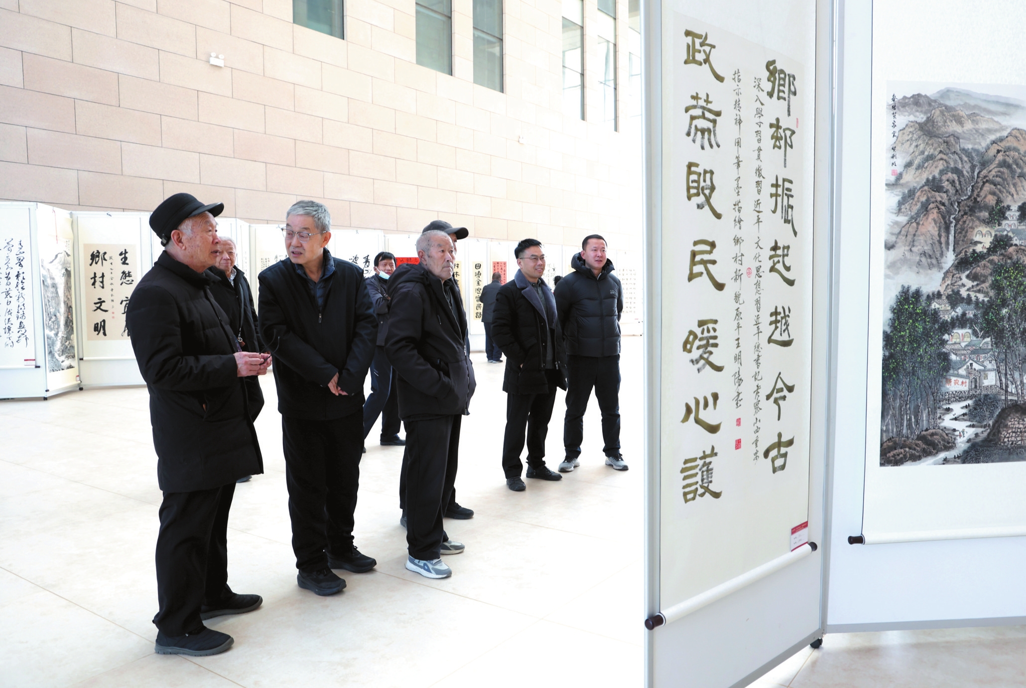 近日,市圖書(shū)館舉辦“鄉(xiāng)村振興·詩(shī)畫(huà)忻州”主題書(shū)畫(huà)攝影展。圖為展覽現(xiàn)場(chǎng)。(范琛攝)