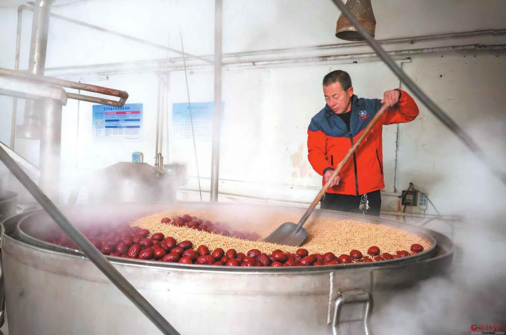 近年來,保德縣貢棗酒開發(fā)基地以“保德油棗”與枸杞入酒,不僅更好地保留了果實(shí)的溫補(bǔ)特性,也釀出了獨(dú)特的地方風(fēng)味。該基地不僅是當(dāng)?shù)赝苿蛹t棗產(chǎn)業(yè)深加工、提升附加值的關(guān)鍵項(xiàng)目,也是將地理標(biāo)志農(nóng)產(chǎn)品轉(zhuǎn)化為特色商品、助力鄉(xiāng)村振興的生動實(shí)踐。圖為保德縣貢棗酒基地,工人在蒸餾車間翻動攪拌麥殼與紅棗等原料,車間內(nèi)蒸汽彌漫。(記者 范琛攝)