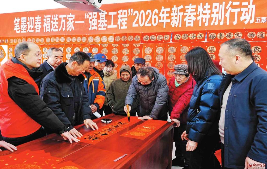 新春將至,年味漸濃。近日,由五寨縣文聯(lián)聯(lián)合縣總工會、團縣委舉辦的“筆墨迎春福送萬家”送春聯(lián)活動走進李家坪鄉(xiāng)李家坪、張家坪村,以筆墨為媒傳遞新春祝福,用文化服務(wù)筑牢基層精神根基,讓“強基工程”的溫暖觸角延伸至鄉(xiāng)村一線。(劉篤效攝)