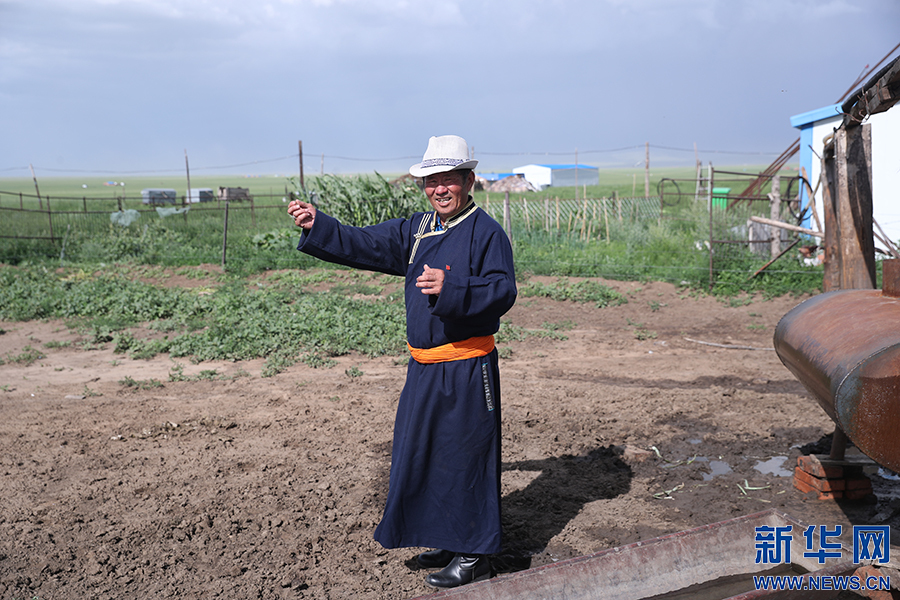 8月2日,其日麥拉圖在介紹自家牲畜牧養(yǎng)情況。新華網(wǎng)記者 焦鵬攝