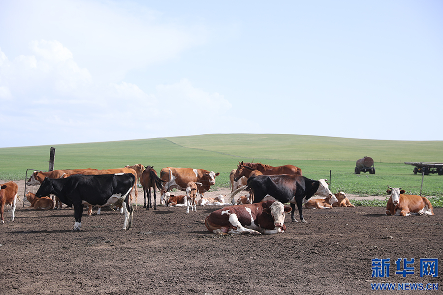 8月2日,其日麥拉圖家的幾頭牛在草場上吃草。新華網(wǎng)記者 焦鵬攝
