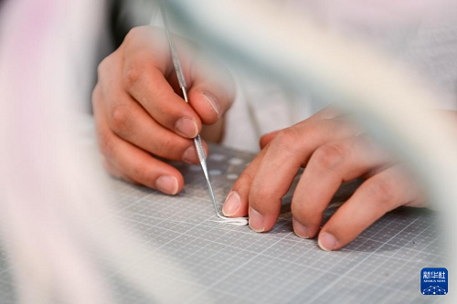 糖藝師張勃在工作室對(duì)比參考書(shū)調(diào)整糖藝零部件的尺寸(1月13日攝)。(新華社記者 鄒競(jìng)一 攝)