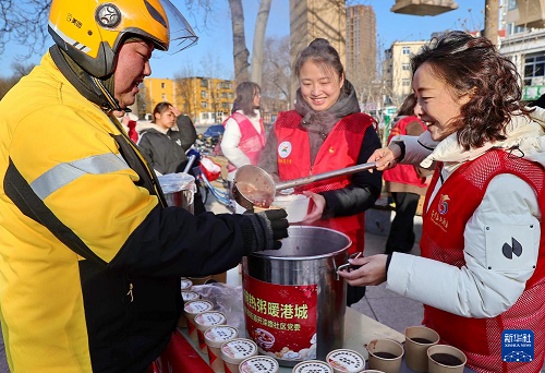 1月25日,河北省秦皇島市海港區(qū)海濱路街道開灤路社區(qū)開展“飄香臘八粥 溫馨暖人心”活動。這是志愿者為網(wǎng)約配送員盛臘八粥。(新華社發(fā) 曹建雄 攝)