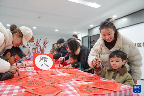 1月25日,在浙江省溫州市鹿城區(qū)大南街道雙蓮橋社區(qū),孩子與家長參加臘八節(jié)傳統(tǒng)文化主題活動。(新華社發(fā) 蘇巧將 攝)