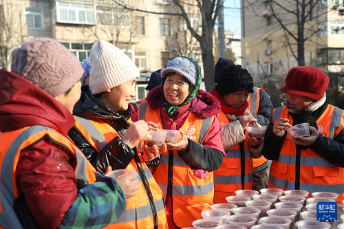 1月25日,在河北省唐山市豐潤區(qū)燕山路街道欣園社區(qū),環(huán)衛(wèi)工人品嘗志愿者送來的臘八粥。(新華社發(fā) 朱大勇 攝)