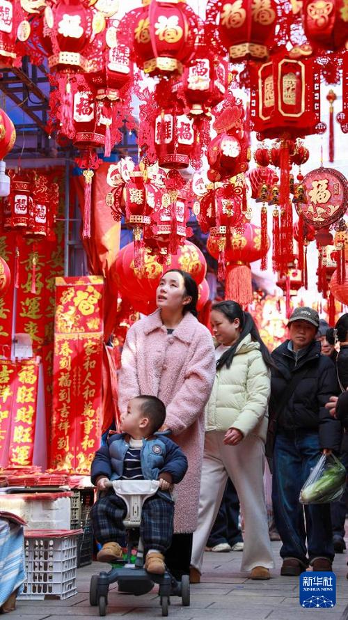 2月11日,家長(zhǎng)帶著孩子在貴州省都勻市年畫(huà)市場(chǎng)選購(gòu)春節(jié)飾品。(新華社發(fā) 肖偉 攝)