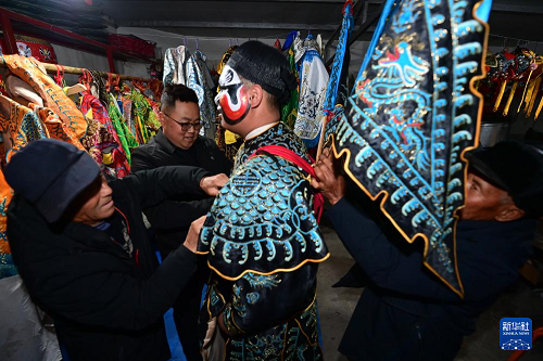 3月2日凌晨,隴縣黃花峪村村民為社火隊隊員穿戴演出服飾。(新華社記者 鄒競一 攝)