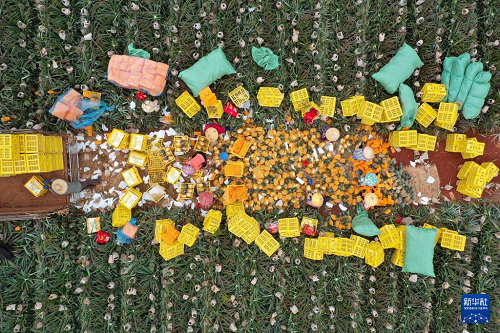 3月12日,農(nóng)民在??诖笃骆?zhèn)將鳳梨打包裝箱(無人機照片)。(新華社記者 郭程 攝)