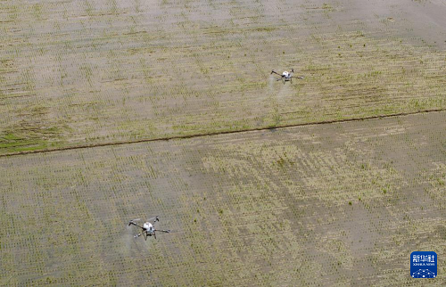 3月24日,在廣東江門臺山市都斛鎮(zhèn),農(nóng)業(yè)無人機在插好秧苗的田間作業(yè)(無人機照片)。(新華社記者 毛思倩 攝)