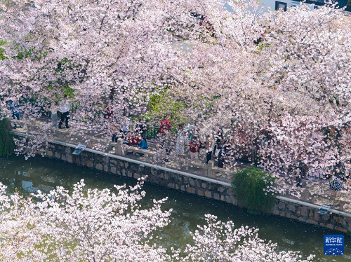 4月5日,人們在江蘇常熟市內的護城河畔觀賞櫻花(無人機照片)。(新華社發(fā) 楊素平 攝)