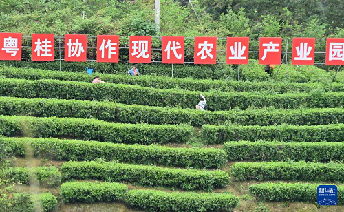 4月12日,在廣西融水苗族自治縣水融香粵桂協(xié)作現(xiàn)代農(nóng)業(yè)產(chǎn)業(yè)園,茶農(nóng)在茶山上采茶。(新華社記者 黃孝邦 攝)