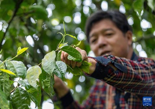 4月11日,重慶市南川區(qū)德隆鎮(zhèn)茶樹(shù)村,茶農(nóng)在古茶樹(shù)上細(xì)心挑選優(yōu)質(zhì)茶芽。(新華社發(fā) 羅川 攝)