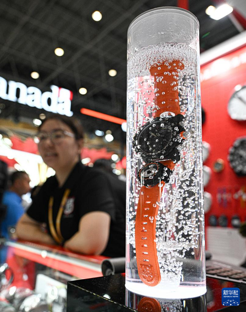 4月16日在第六屆消博會瑞士展臺拍攝的手表。(新華社記者 蒲曉旭 攝)