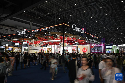 4月16日,第六屆消博會加拿大國家館所在的全球特色消費(fèi)展區(qū)人頭攢動。加拿大是本屆消博會主賓國。(新華社記者 蒲曉旭 攝)