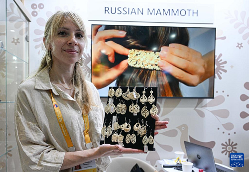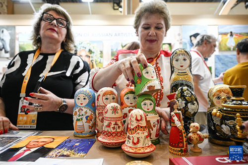 4月16日,參展商在第六屆消博會現(xiàn)場展示俄羅斯工藝品。(新華社記者 蒲曉旭 攝)