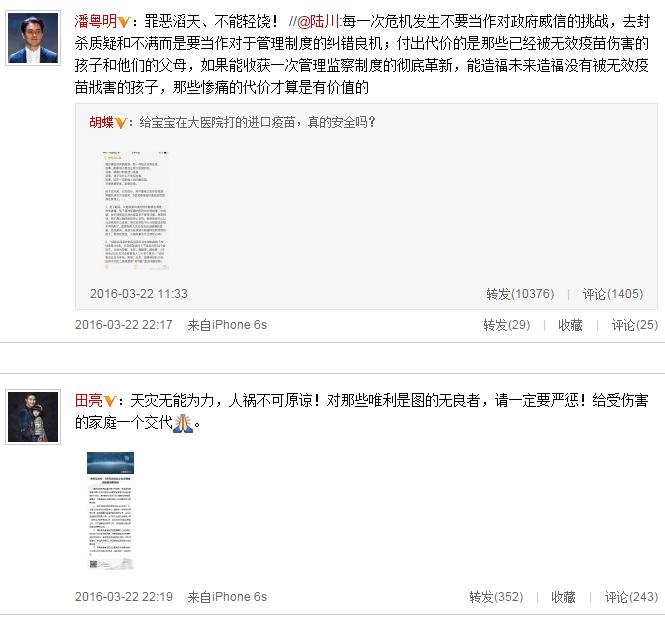 主持人胡蝶對(duì)疫苗產(chǎn)生莫大的質(zhì)疑,稱:“給寶寶在大醫(yī)院打的進(jìn)口疫苗,真的安全嗎?”隨后,陸川轉(zhuǎn)發(fā)此微博,并寫道:“每一次危機(jī)發(fā)生不要當(dāng)作對(duì)政府威信的挑戰(zhàn),去封殺質(zhì)疑和不滿而是要當(dāng)作對(duì)于管理制度的糾錯(cuò)良機(jī);付出代價(jià)的是那些已經(jīng)被無(wú)效疫苗傷害的孩子和他們的父母,如果能收獲一次管理監(jiān)察制度的徹底革新,能造福未來(lái)造福沒(méi)有被無(wú)效疫苗戕害的孩子,那些慘痛的代價(jià)才算是有價(jià)值的。”潘粵明也寫在微博下“罪惡滔天、不能輕饒”的話語(yǔ)。