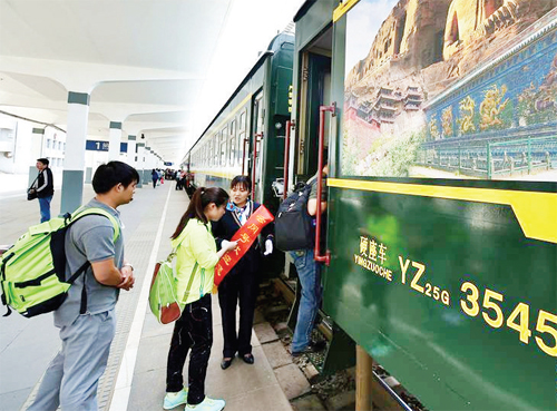 5月27日,旅客在大同火車站檢票登上Y665次列車。當(dāng)日,山西省首趟“Y”(游)字頭城際旅游專列Y665次列車從大同火車站駛出,開往太原,兩座城市間的旅行時間縮短至3小時以內(nèi)。這輛被命名為“云岡號”的一站直達(dá)列車由6節(jié)硬座車、1節(jié)硬臥車、1節(jié)軟臥車組成,每逢周五、六、日發(fā)車,運(yùn)行時長較目前兩地開行的最快列車還要節(jié)省近50分鐘。(來源:黃河新聞網(wǎng))