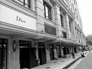 昨日,北京晨報記者來到位于建國門橋附近的中海楓丹公館,看到整個樓盤有五棟樓,呈凹字形。建筑物四周設(shè)有30多個大小不一的底商,每個底商頂部都掛著一個看似國際大牌的招牌,既有奢侈品,也有快餐業(yè),顏色鮮艷,十分奪目。就在這些大牌的招牌旁邊,張貼著大幅廣告“黃金旺鋪火爆招商中”。