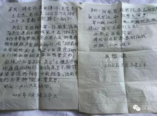 兩封信中敘述到,“河南省高級(jí)人民法院于2015年7月28號(hào)上午11時(shí)親自來(lái)到河南省第四監(jiān)獄提審我,又重新讓我踩了一次腳印。隨后,2015年10月23日,河南省高級(jí)人民法院和洛陽(yáng)市公安局技術(shù)鑒定科又一次將我提出監(jiān)獄,在監(jiān)獄大門(mén)口路南邊的野地半坡上,又重新讓我踩了石膏模擬腳印。”