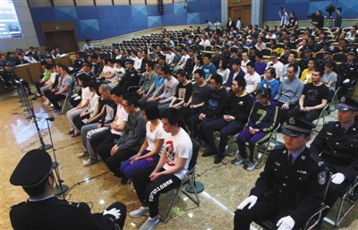 因?yàn)楸桓嫒颂?,法院最大的法庭也無法容納。開庭前法院已將最大法庭前4排旁聽席的座位拆下,以擴(kuò)大審判區(qū)的面積,同時(shí)從兄弟法院協(xié)調(diào)了法警30人,出動(dòng)了12輛警車接送被告人。
