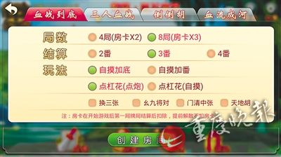 進(jìn)入游戲后,界面顯示“創(chuàng)建房間”和“加入房間”兩項(xiàng)。玩家創(chuàng)建房間時(shí),可選擇局?jǐn)?shù)、玩法等具體設(shè)置,還能選“自摸加底”“自摸加番”“點(diǎn)杠花(點(diǎn)炮)”“點(diǎn)杠花(自摸)”“換三張”等,然后通過(guò)微信邀請(qǐng)好友加入牌局。接到邀請(qǐng)的玩家,輸入房間號(hào)后就能進(jìn)入牌局,通過(guò)手機(jī)聯(lián)網(wǎng)打麻將。