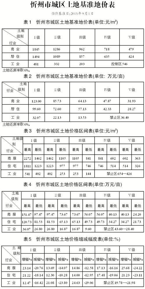 忻州市新一輪城鎮(zhèn)土地面積134.99平方公里基準(zhǔn)地價更新工作已經(jīng)省國土資源廳組織有關(guān)專家檢查驗(yàn)收。根據(jù)《山西省國土資源廳關(guān)于忻州市城鎮(zhèn)土地定級估價更新結(jié)果的批復(fù)》(晉國土資技審〔2015〕118號),現(xiàn)將忻州市城鎮(zhèn)土地基準(zhǔn)地價予以公布實(shí)施。