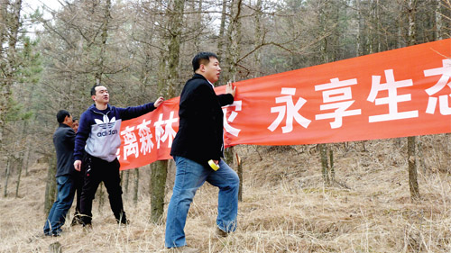 清明節(jié)來(lái)臨之際,靜樂公路管理段駐赤泥窊鄉(xiāng)范家洼村扶貧工作隊(duì)深入開展護(hù)林防火宣傳。圖為工作隊(duì)員深入林區(qū)懸掛護(hù)林防火標(biāo)語(yǔ)。(李永珍 攝)