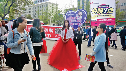 4月23日11點(diǎn)左右,記者在我市城區(qū)忻州一中校門口看到,一名身穿紅色婚紗裙的女生舉著牌子——“我媽說了,考上公務(wù)員,咱們領(lǐng)證去”。當(dāng)天是2016年山西省公務(wù)員考試筆試的日子,這是一家公考培訓(xùn)機(jī)構(gòu)在考點(diǎn)附近進(jìn)行宣傳活動(dòng),宣傳者靚麗的外表、婚紗裙的著裝和新奇的廣告語(yǔ)吸引了很多考生的目光,甚至一些路人也駐足觀看。不過,這種夸張的廣告詞,所謂的“考上公務(wù)員去領(lǐng)證”的想法是否正確,也應(yīng)該引起大家的反思。(許凈 攝)