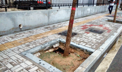 8月14日,記者在城區(qū)建設(shè)南路與長征西街交匯處往南不遠處發(fā)現(xiàn),人行道一棵樹栽種區(qū)內(nèi)有一個破洞,并且有往左側(cè)延伸的趨勢,在雨水的沖擊下可能會對樹木和周圍道路造成影響,希望相關(guān)部門能夠重視,做到防患于未然。(許凈 攝)
