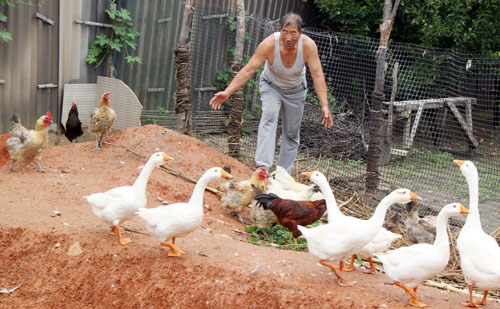 8月16日原平市新原鄉(xiāng)新華街村農(nóng)民正在喂養(yǎng)鵝和雞。該市農(nóng)民多措并舉因地制宜發(fā)展特色養(yǎng)殖業(yè)促增收。(趙月仁 攝)