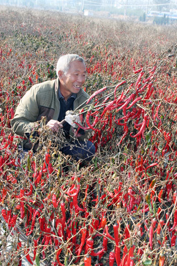11月3日,原平市南灘村農(nóng)民正在查看種植的北京紅辣椒準(zhǔn)備采摘。該村調(diào)整產(chǎn)業(yè)結(jié)構(gòu),由原來種植玉米地,如今引進(jìn)種植了新品種北京紅辣椒,長(zhǎng)勢(shì)喜人促進(jìn)農(nóng)業(yè)增產(chǎn)農(nóng)民增收,老農(nóng)高興地說俺們?nèi)缃窨奎h的好政策,生活就像紅辣椒一樣過的紅紅火火。(趙春曉 攝)