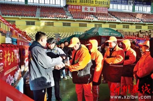 1月19日上午,山西熊奪寶網(wǎng)絡科技有限公司面向忻州市環(huán)衛(wèi)系統(tǒng)開展“獻愛心迎佳節(jié)”活動,來自忻州市市容環(huán)境衛(wèi)生管理處的50名環(huán)衛(wèi)工人代表,每人領到了一份新鮮雞蛋?,F(xiàn)場的一位工作人員告訴記者:“環(huán)衛(wèi)工人們?yōu)榱顺鞘械母蓛粽麧嵏冻隽诵燎诘暮顾?,希望這些雞蛋能為他們補補身體。除現(xiàn)場領取雞蛋的50名環(huán)衛(wèi)工人之外,我市另外的1000多名環(huán)衛(wèi)工人也將陸續(xù)領到愛心雞蛋?!鳖I到雞蛋的環(huán)衛(wèi)工李大姐高興地說:“今年過年雞蛋也不用買了,實在是太好了!”(王菲 郭劍鳴 攝)