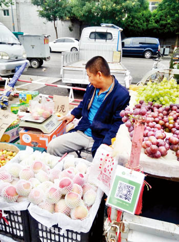 7月30日,位于和平街市中級人民法院旁的便民市場上,一位水果商販正在出售水果。三輪車上掛著微信支付二維碼,告訴顧客可以用手機(jī)掃一掃買水果。小販說:“現(xiàn)在用手機(jī)支付的人越來越多,特別是年輕人。手機(jī)支付,不用找零,不怕假幣,‘掃一掃’,就是好!”