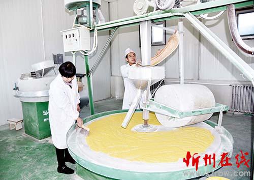 代縣南北兩半坡所產(chǎn)的小米,由于地理環(huán)境特殊,無(wú)霜期長(zhǎng),光照充足,晝夜溫差大,不僅色澤金黃品質(zhì)優(yōu),而且口感好,久負(fù)盛名,十分走俏。該公司用石碾加工小米,以散裝每公斤14元、高檔包裝每公斤16元出售,銷(xiāo)往北京、太原等地。圖為公司員工用石碾加工小米(石俊文 劉睿)