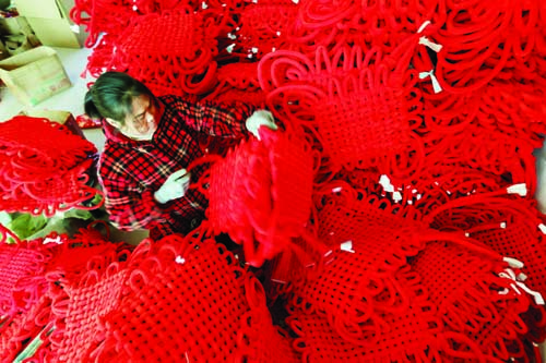 1月11日,在山東省臨沂市郯城縣紅花鎮(zhèn)一家工藝品廠(chǎng),工人在整理中國(guó)結(jié)。春節(jié)臨近,山東臨沂、棗莊等地的節(jié)慶飾品車(chē)間、手工藝人開(kāi)始忙碌起來(lái),人們加緊制作各種春節(jié)飾品,供應(yīng)市場(chǎng)。據(jù)新華社 張春雷 攝