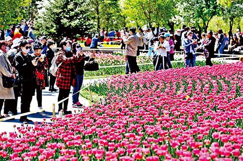 5月7日,游人在長春公園內(nèi)賞花。隨著氣溫升高,吉林省長春公園內(nèi)百萬余株郁金香競相綻放,吸引眾多游人前來參觀游覽。據(jù)新華社記者 張楠 攝