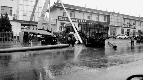 當(dāng)天夜里,五臺縣東冶鎮(zhèn)遭遇持續(xù)強降水天氣過程,公司調(diào)控中心值班員在凌晨3時22分發(fā)現(xiàn)10千伏829北大街線速斷掉閘,立刻電話通知所管轄區(qū)東冶供電所。得知情況后,該供電所組織搶修人員迅速趕往事故現(xiàn)場,勘查電桿及線路受損情況。經(jīng)查勘,原來是一輛重型載貨卡車在駛經(jīng)五臺縣東冶鎮(zhèn)時,因連夜大雨導(dǎo)致路面濕滑把一基電桿給撞倒了,斷裂的電桿壓在大卡車上,大卡車無法行駛。這一意外事件,造成了10千伏北大街線失電、沿線居民用電中斷。10千伏829北大街線是東冶鎮(zhèn)街道主要干線,生產(chǎn)任務(wù)繁重,能否盡快恢復(fù)送電直接關(guān)乎沿線居民的切身利益。