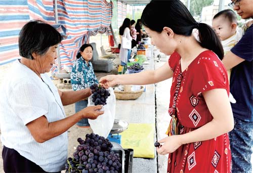 9月9日,河曲縣焦尾城村葡萄交易市場(chǎng),迎來(lái)一撥又一撥選購(gòu)葡萄的顧客。該村大力發(fā)展無(wú)公害綠色葡萄項(xiàng)目,所產(chǎn)葡萄酸甜適度,口感極佳,在廣大消費(fèi)者心目中樹(shù)立了良好的品牌形象。賈金理 攝