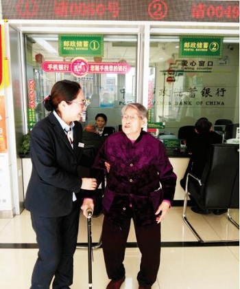 城區(qū)利民街西口郵政儲蓄銀行員工熱情為客戶服務(wù),受到群眾好評。圖為該行客服經(jīng)理微笑攙扶、護(hù)送八旬老客戶辦理完業(yè)務(wù)后離開大廳。王金龍 攝