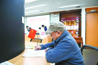 4月3日,中華遺囑庫(kù)第二登記中心揭牌成立,前來(lái)體驗(yàn)遺囑辦理程序的老人蔡先生正在填寫(xiě)相關(guān)登記表。(記者 和冠欣 攝)
