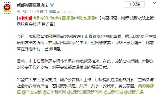 4月8日,成都網(wǎng)警對(duì)此辟謠稱(chēng):接網(wǎng)民問(wèn)詢“成都夜晚上街露紋身會(huì)被抓”真假,據(jù)悉此信息已在微信朋友圈內(nèi)流傳,并冠以掃黑除惡的由頭。經(jīng)網(wǎng)警核實(shí),此條信息為謠言,此前曾在外地出現(xiàn),已被辟謠。目前,本市掃黑除惡專(zhuān)項(xiàng)斗爭(zhēng)仍在持續(xù)縱深推動(dòng),在此,成都公安感謝廣大群眾對(duì)公安工作的支持,對(duì)平安成都建設(shè)做出的積極貢獻(xiàn)。希望廣大市民繼續(xù)支持、配合公安機(jī)關(guān)工作,積極提供違法犯罪線索,主動(dòng)參與社會(huì)治安綜合治理,警民攜手共建、共治、共享平安城市、美麗家園。