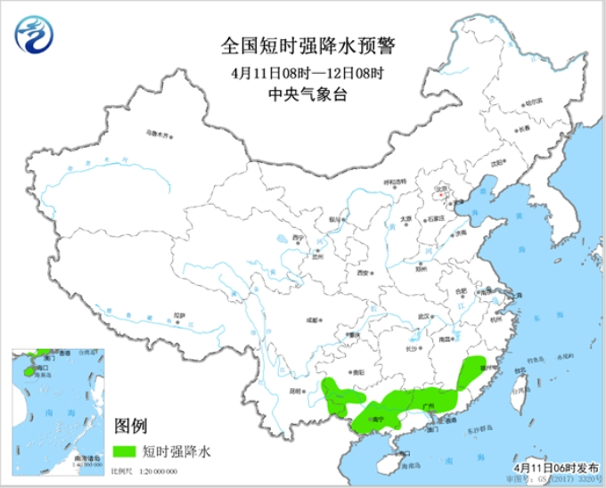 預(yù)計4月11日08時至12日08時,貴州西南部、福建西南部、廣西西部和東部、廣東西北部等地的局地將有8-10級雷暴大風(fēng)或冰雹天氣;此外,貴州西南部、福建西部、廣西大部、廣東中北部等地的部分地區(qū)將有短時強(qiáng)降水天氣,小時雨強(qiáng)20-40毫米,局地可達(dá)50毫米以上。