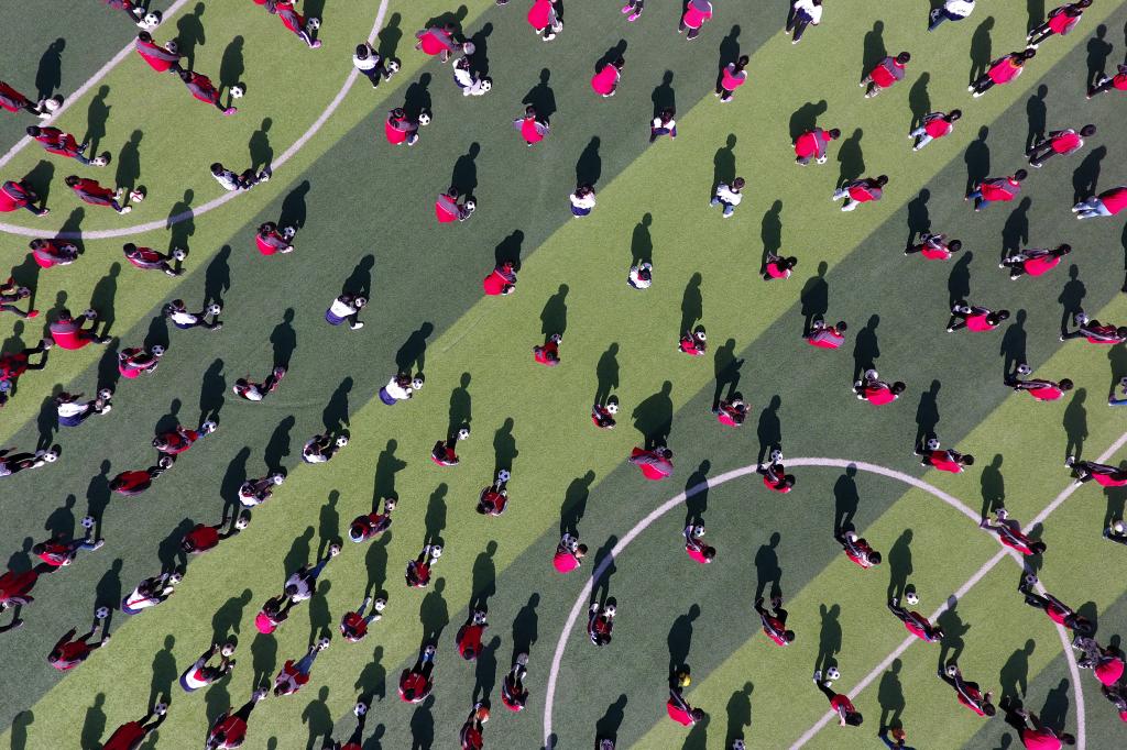 ↑這是學(xué)生們在做足球操(4月15日無人機拍攝)。新華社記者詹彥攝