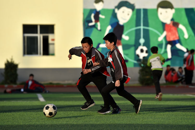 ↑這是學(xué)生們下課后在球場上踢足球(4月17日攝)。新華社記者詹