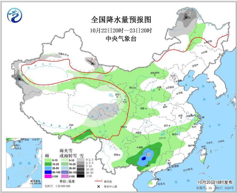10月22日20時(shí)至23日20時(shí),新疆沿天山地區(qū)和南疆西部、青海東南部、西藏東北部及內(nèi)蒙古東北部、黑龍江西北部等地有小到中雪或雨夾雪,局地大雪(5~9毫米),西北地區(qū)東部、內(nèi)蒙古中西部、山西南部、西南地區(qū)東南部、江南中西部、華南大部等地有小雨,其中貴州東南部、廣西中北部等地有中到大雨,局地有暴雨(50~65毫米)。新疆東部部分地區(qū)有5~6級(jí)風(fēng)(見圖3)。