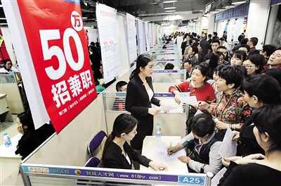 23日上午11點,重慶市江北區(qū)觀音橋一家人才招聘市場內(nèi),一個掛著“五十萬招兼職”海報的招聘展位前人頭攢動。排隊等候填表報名的人將兩米寬的過道塞得滿滿當(dāng)當(dāng)。