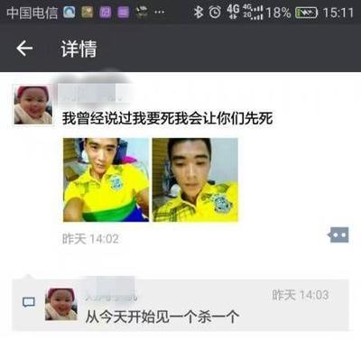 朋友圈圖片顯示:男孩受傷嚴重,眼睛被打腫,大小腿有多處傷痕。圖片轉自另一男子,最讓人覺得不可理喻的是,該男子不僅在朋友圈曬出孩子被打傷的圖片,還配文稱“心里面高興”、“我會繼續(xù)折磨死兩個小孩子”。另外還搭配自拍照稱“我曾經(jīng)說過我要死我會讓你們先死”并跟帖“從今天開始見一個殺一個”。